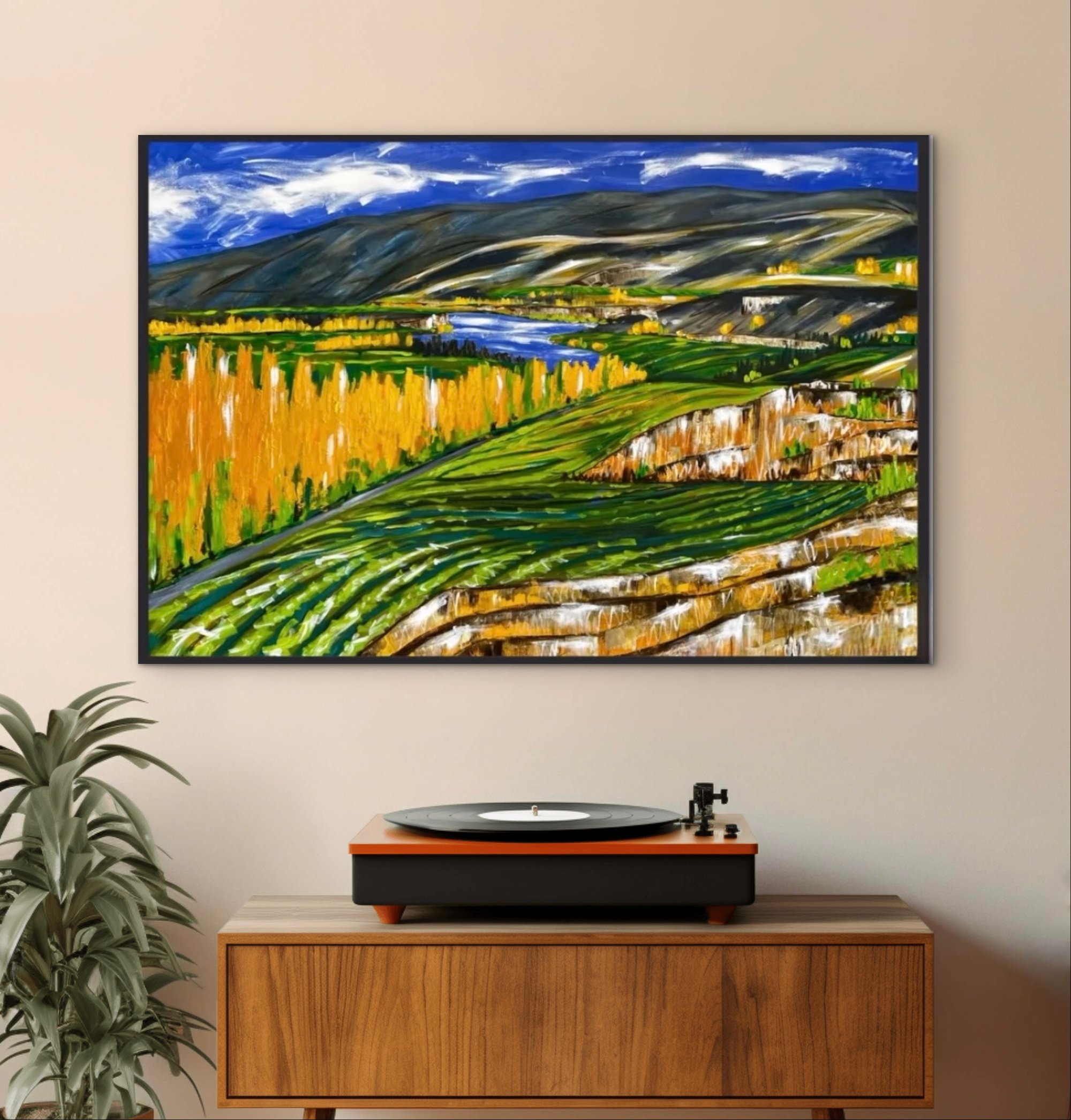 View from the sluicing track, over vineyards towards old Cromwell. Framed on canvas, 80x120cm