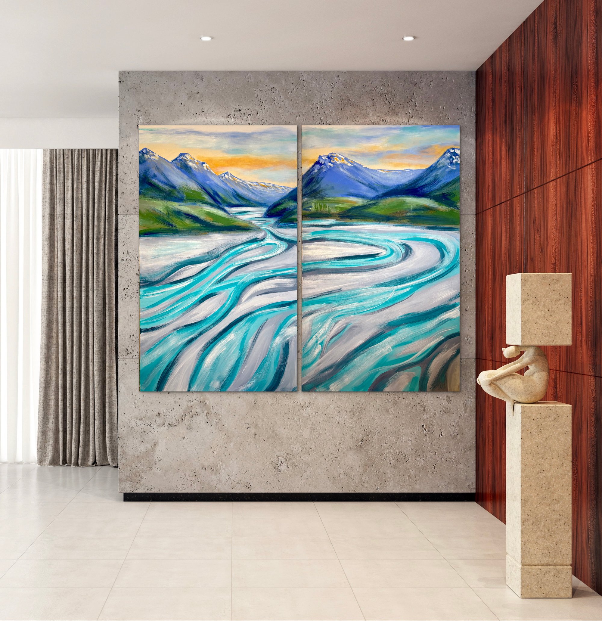 182x153cm over two canvases. Depicts the teal coloured waters of the Dart River in Glenorchy. A playground of my childhood.