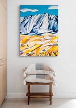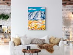 Cloaked in snow, the inviting slopes of Cardrona ski field rise above the orchard land against a clear blue Winters sky.