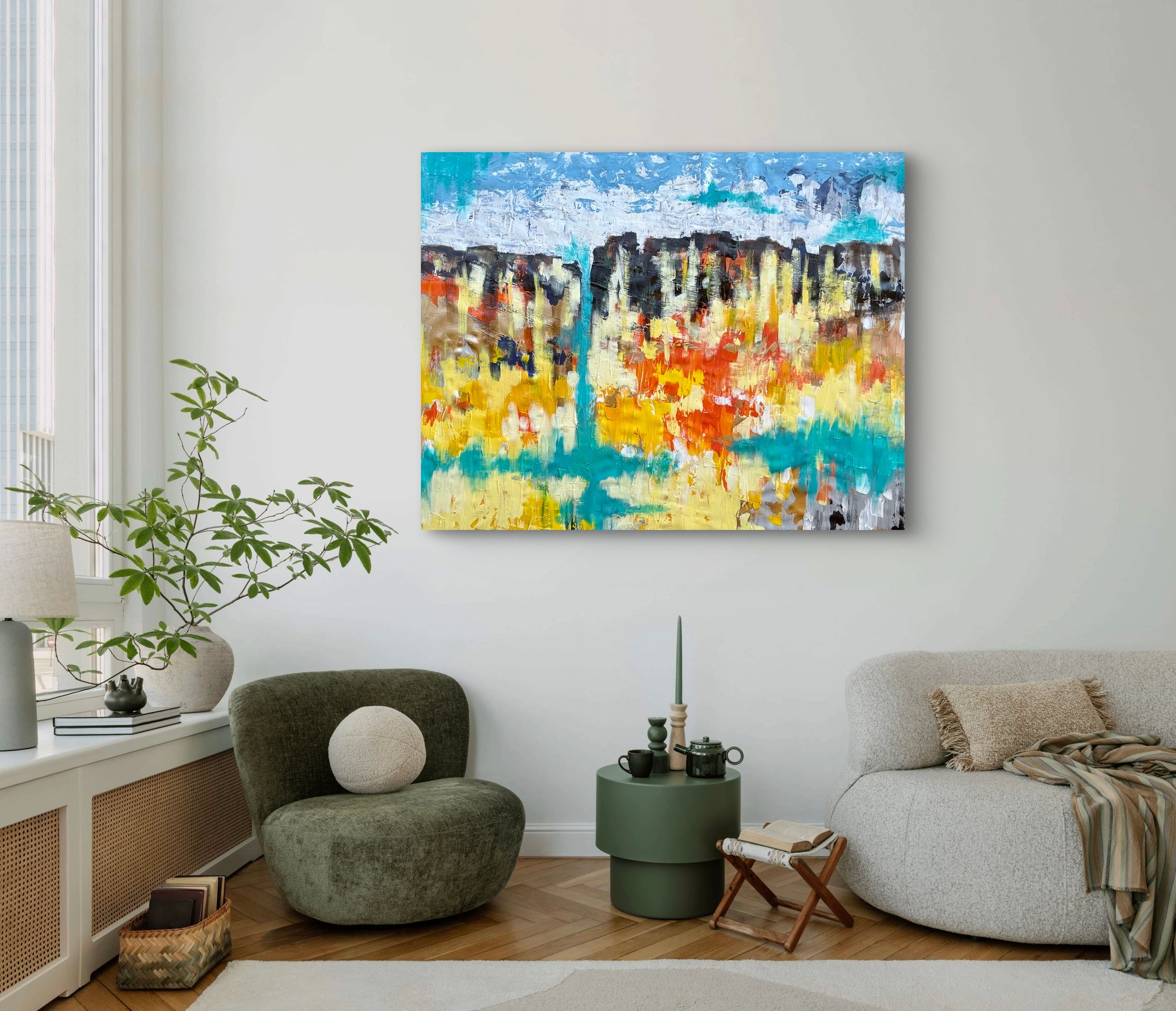 154x120 stretched canvas original. Inspired by a day of ocean swimming and beach walking by towering lime stone cliffs.
