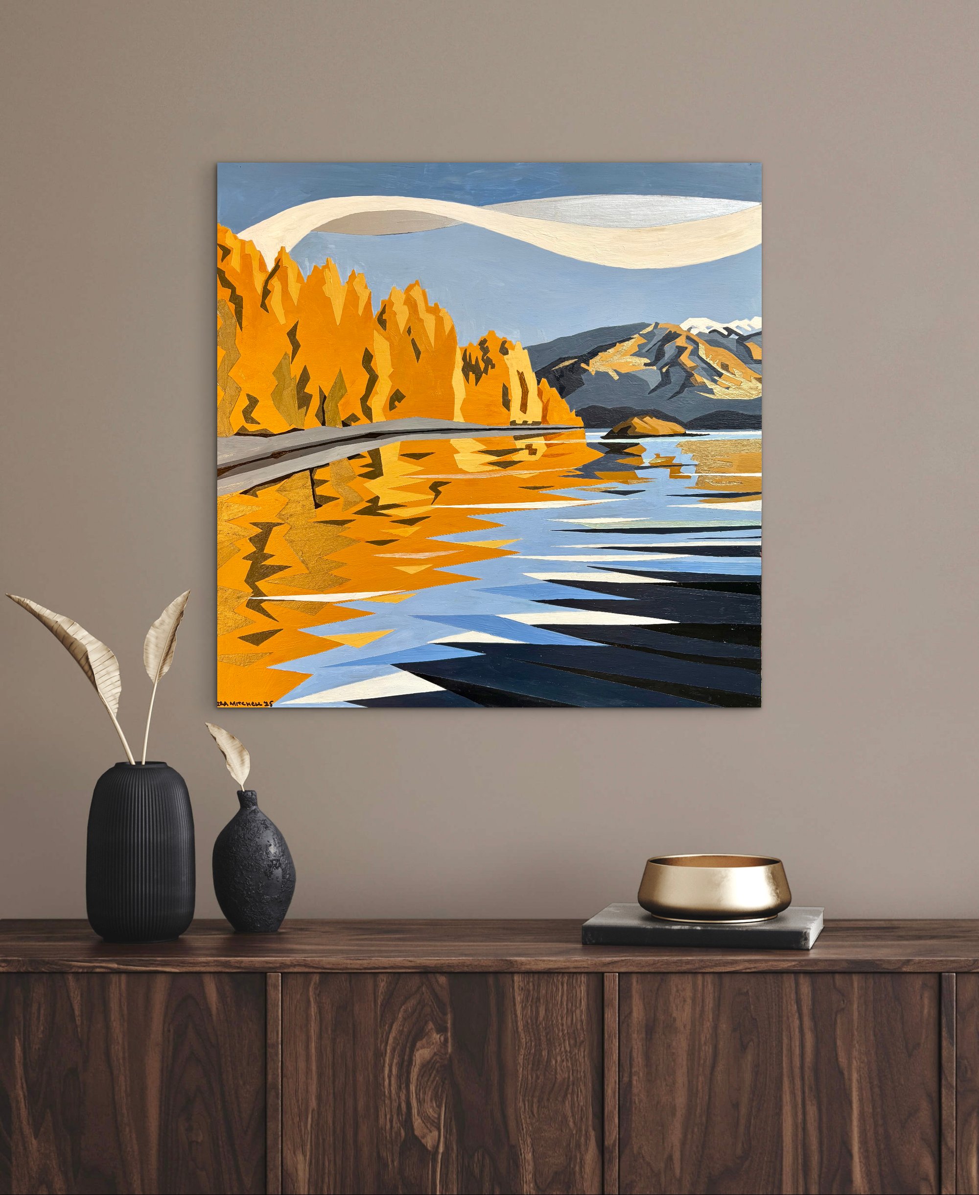View from my kayak on Lake Wanaka, to the gold trees of Eely point. 41x41cm on beechwood