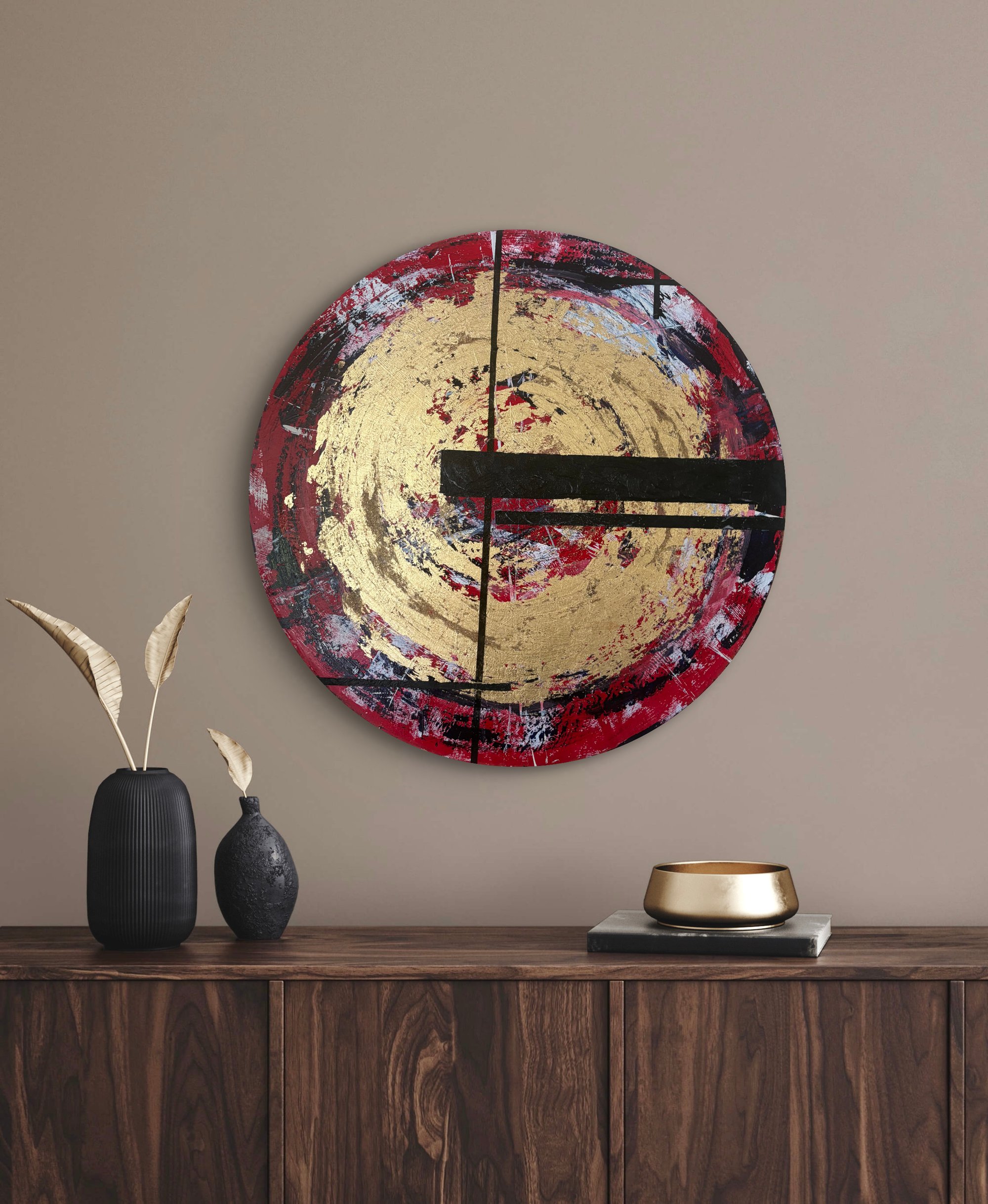 Describing the gold rush of Central Otago, the shear brut force, harsh elements and engineering required to scrounge out a living; if you were lucky. Acrylic paint & gold leaf on 50cm beechwood, ready to hang.