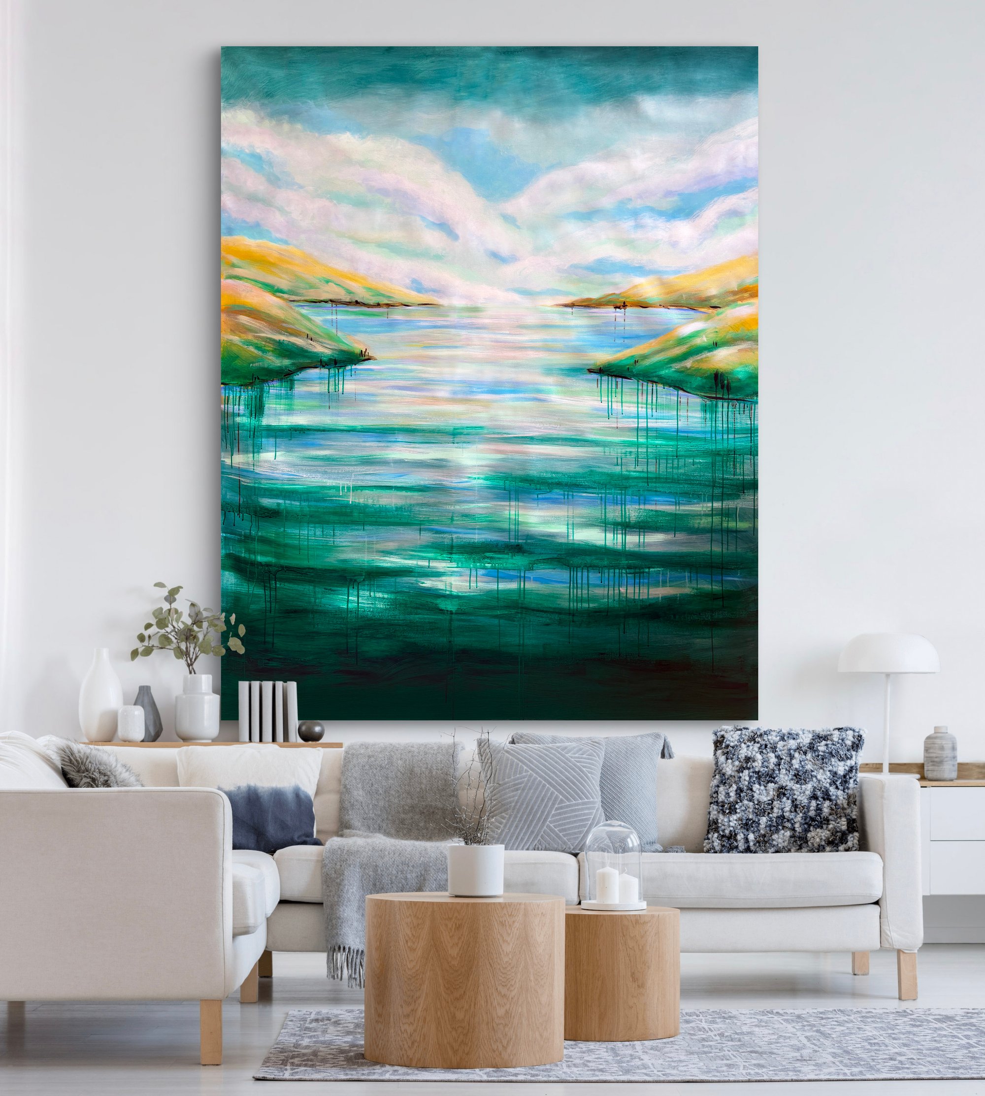 193x162cm original on canvas. Inspired by a trip to Diamond harbour on a misty day, when the water and sky are one. Framing is optional