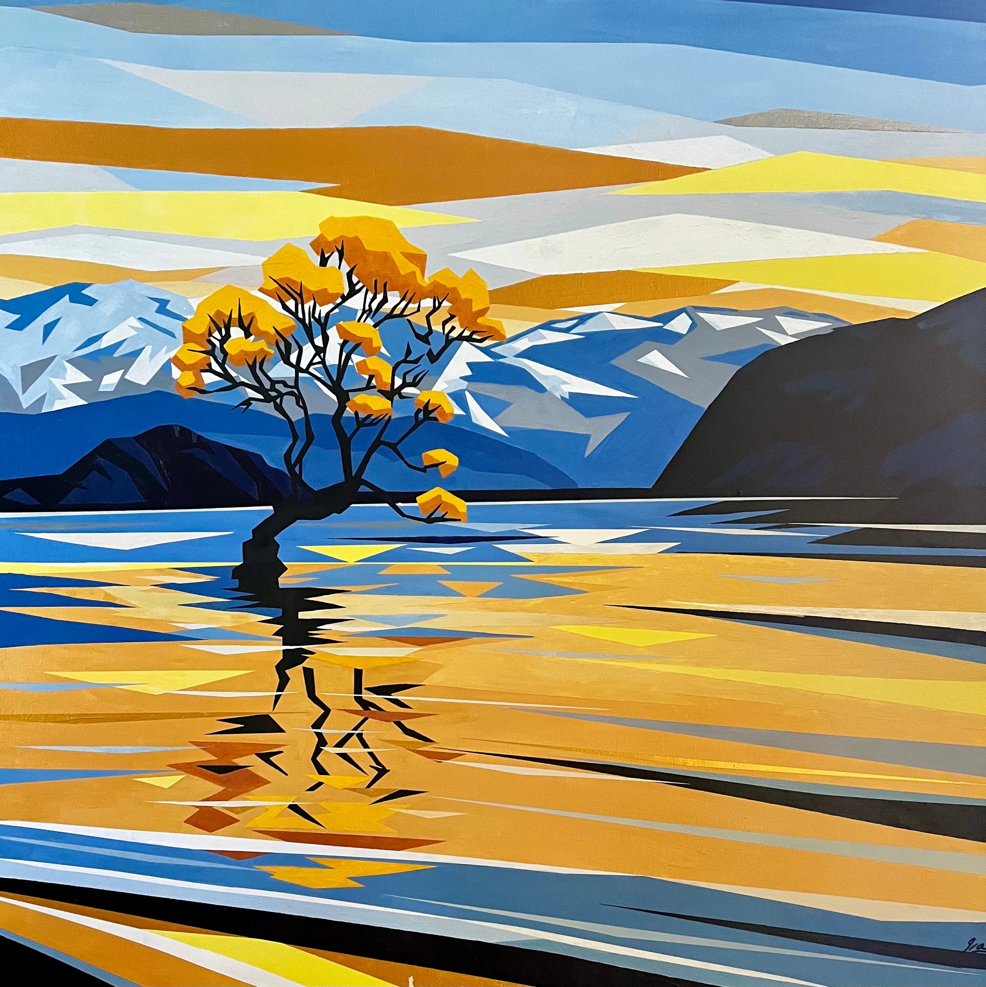 Calming golden evening light, Silhouetting the iconic Wanaka tree. 101x101cm